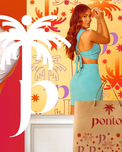 A marca Ponto I é uma loja de roupas femininas cujo intuito foi desenvolver uma marca requintada e tropical. o P em evidência casa com o coquero florescendo apontando para o sol, como uma ideia e florescimento.